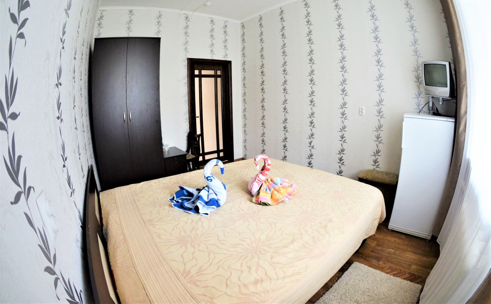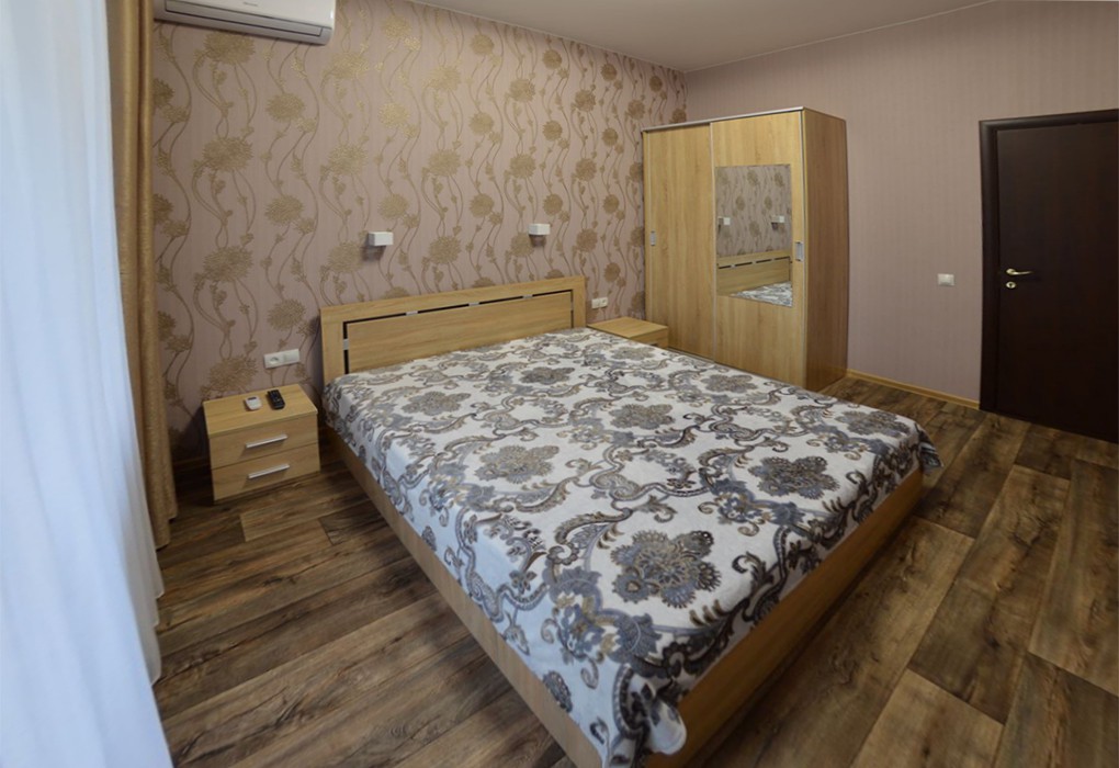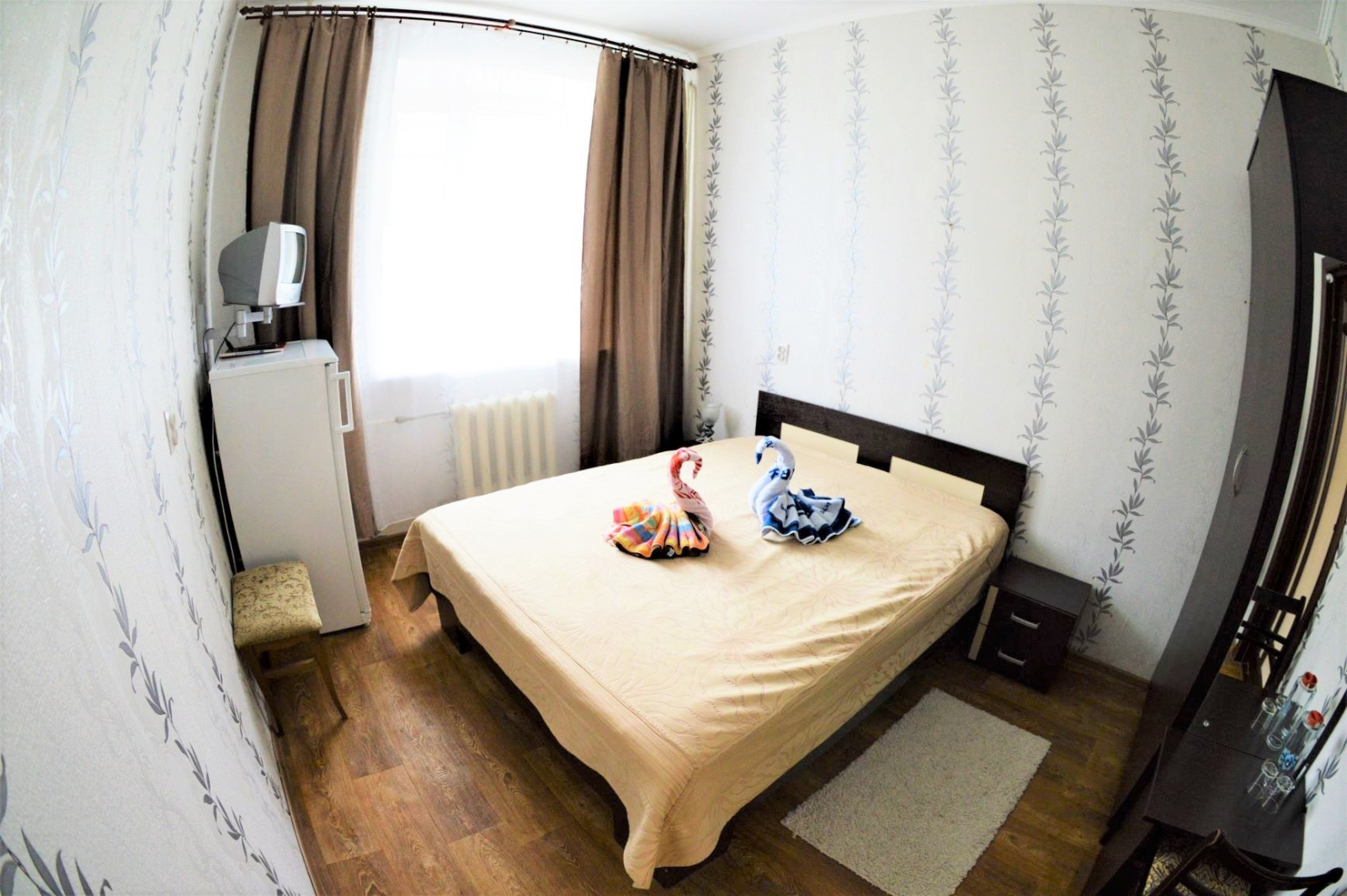 2 осн. места. 1 доп. место. Мебель: вешалка, зеркало, кровать двуспальная, прикроватные тумбочки, столик журнальный, стулья, шкаф. Оборудование: телевизор, холодильник, чайный набор посуды, электрочайник. Санузел: с душем, туалетные принадлежности. Сервис: Wi-Fi бесплатно, смена полотенец, смена постельного белья, уборка номера.
